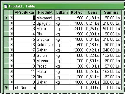 - номер продукта (особая кодировка продукта – в данной таблице по порядку поступления продукта, но может быть, например, по международной Гармонизированной системе описания и кодирования товаров);