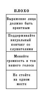 По рассказам профессионалов, типичная картина выступления неподготовленных менеджеров различного уровня на бизнес-конференциях обычно такова: человек, крадучись, будто его преследуют, выходит на трибуну. Шарит по карманам, настороженно оглядываясь по сторонам. Достает бумажку с заготовленной речью и говорит: "Ой, простите, я здесь случайно... постараюсь не 'занимать ваше время... Я не оратор, выступать не умею..." При этом весь вид оратора говорит: как я вообще здесь оказался? Затем он начинает читать то, что написано у него на бумажке. Изредка отрывает глаза от текста, чтобы посмотреть на потолок или на свои ботинки. Если оратор держит бумажку с текстом не двумя руками, то вторая рука, как правило, оказывается вцепившейся в стол или кафедру. Иногда свободной рукой выступающий шарит по карманам, доставая оттуда попеременно то очки, то смятый носовой платок, с удивлением все это разглядывая. Речь звучит однотонно, причем слышат ее обычно только первые три ряда. По оратору видно, что текст ему очень надоел. Лицо его принимает различные выражения - то удивление (видимо, тому, что написано в бумажке), то задумчивость (наверное, пытается понять, что такое он вообще говорит). Наконец он делает вид, что выступил. На лице явное облегчение. Аплодисменты в зале. Оратор спускается со сцены с явным удовольствием - обязательная программа позади.