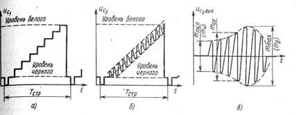 Рис. 2.3. Испытательные сигналы для формирования шкалы перепадов яркости на экране ТВ приемника Ucl (а) и для измерения нелинейных искажений сигнала яркости Uc2 (б); Uс2вых — синусоидальная насадка, выделенная полосовым фильтром из сигнала Uc2 на выходе тракта (в).