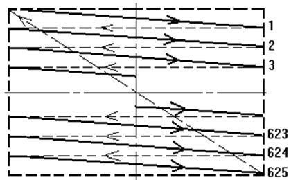 Прежде чем приступить к анализу помехи необходимо рассмотреть принцип формирования растра, так как это поможет нам в определении типа помехи и её параметров. Принцип формирования растра поясняется на рисунке 4.2. На этом рисунке сплошными стрелками показан прямой ход луча, а прерывистыми – обратный ход луча.