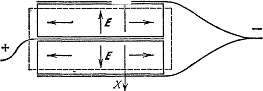 На рис.6 показан двойной пьезоэлемент (составленный из двух пластинок), работающий на сжатие. Пластинки вырезаны из кристалла таким образом, что они одновременно либо сжимаются, либо растягиваются. Если, наоборот, сжимать или растягивать такой пьезоэлемент внешними силами, то между его обкладками появляется напряжение. Соединение пластинок в этом пьезоэлементе соответствует параллельному соединению конденсаторов.