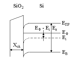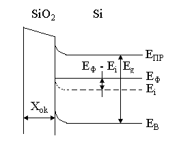 >0, то возникает поле направленное от полупроводника к затвору. Это поле смещает в кремнии основные носители (электроны) по направлению к границе раздела кремний – оксид кремния. В результате на границе возникает обогащенный слой с избыточной концентрацией электронов. Нижняя граница зоны проводимости, собственный уровень и верхняя граница валентной зоны изгибаются вниз.