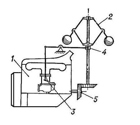 ). Цель управления - поддержание постоянной частоты вращения маховика, управляемый объект - двигатель 1; управляющее воздействие - положение регулирующей заслонки дросселя 3