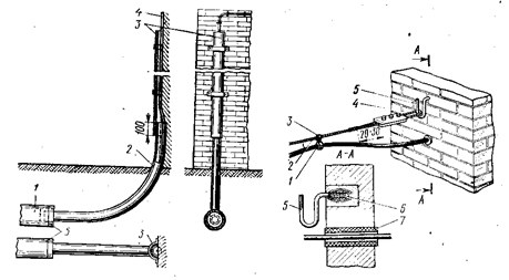 3-изогнутые трубы, 4-бетон, 5-фундамент, 6-подвал, 7-крепление