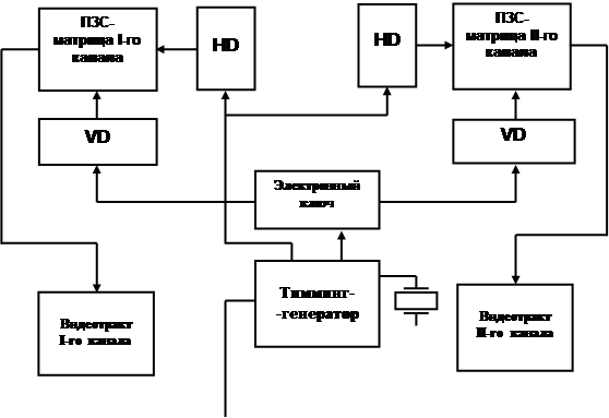 В разрабатываемой системе используется групповой метод деления стереопары, но принцип деления отличается от вышеописанных. В процессе формирования стереопары образуется видеосигнал, содержащий последовательность четных и нечетных полей двух кадров стереопары. Одна ПЗС матрица формирует сигналы первого и второго поля первого кадра стереопары, а вторая, соответственно, поля для второго кадра стереопары. Применяя при воспроизведении очки с жидкокристаллическими индикаторами (ЖКИ) и коммутируя ЖКИ с частотой полей, мы разделяем кадры стереопары для правого и для левого глаза соответственно. Данные системы воспроизведения являются стандартными и в данном проекте не рассматриваются.