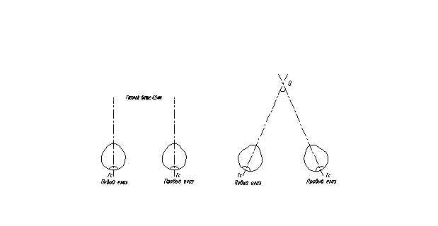 Объемность предметов и их пространственное расположение непосредственно могут восприниматься как при монокулярном зрении (одним глазом), так и при бинокулярном (двумя глазами). В первом случае главную роль играют физиологические факторы (зрительная память, ощущение различия в напряжении мышц при аккомодации и т.п.). Опираться на эти факторы при построении телевизионной системы, где глаз заменяется передающей трубкой, нельзя – необходимо прибегнуть к использованию свойств бинокулярного зрения, где основную роль играет глазной базис – расстояние между зрительными осями при рассмотрении удаленных предметов (рис. 1.2). Для разных людей он немного отличается, но в среднем составляет 65 мм. Угол a при пересечении зрительных осей называется углом конвергенции (сведения в одну точку). Каждому положению объекта соответствует определенный угол конвергенции, что сопровождается некоторой мускульной работой поворота глаз вокруг центров вращения. Сравнение в сознании мускульных напряжений, связанных с изменением угла конвергенции, дает представление о том, ближе или дальше расположен предмет.
