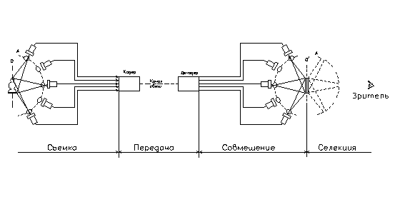 Последовательная передача. Последовательный способ передачи стереопары применяется в случае использования временного параллакса (при относительном движении камеры и объектива) или при проектировании левого и правого изображений на мишень одной передающей трубки. В последнем случае кадры стереопары можно расположить на мишени трубки, или рядом по горизонтали (последовательная передача по строкам), или рядом по вертикали (последовательная передача по полям или кадрам). При вертикальном расположении кадров площадь мишени используется более полно, но это требует специальной призменной приставки к горизонтально расположенным объективам [1, глава 4]. Последовательная передача стереопары требует удвоенной полосы частот по сравнению с обычным двухмерным телевидением. Принципы воспроизведения стереопары на приемной стороне освещены в книге под ред. П.В.Шмакова “Стереотелевидение” (М: Связь, 1968). Художественную передачу объемных изображений целесообразно обогащать стереофоническим изображением.