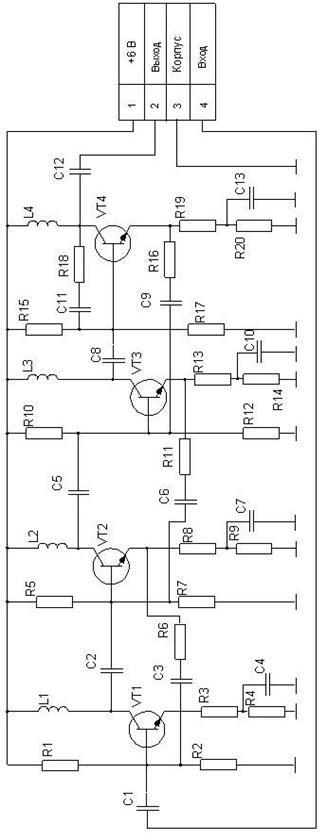 Все перечисленные выше достоинства можно реализовать в усилителе с перекрёстными обратными связями [1,2]. Такие усилители не требуют настройки, имеют стабильные параметры и сохраняют неизменной полосу пропускания при наращивании числа каскадов.