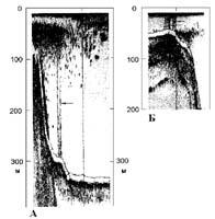 Газонасыщенность осадков. Отличительной особенностью геологического строения дна Камчатского залива является широкое развитие подводных газовых просачивании различной интенсивности [17,34]. Наиболее распространены они в северной части залива, где участки газонасыщенных осадков оконтуривают верховья детально исследованного притока и далее тянутся в южном направлении (по простиранию шельфа), а также маркируют упомянутый выше горизонт уплотненных осадков, который был вскрыт эрозией на глубине 160-180 м. Признаки просачивании в виде вертикальных гидроакустиеских аномалий фиксировались по ходу судна самописцем эхолота (см. рис.4) [17,]. На газонасыщенность вмещающих осадков указывает падение скоростей прохождения сейсмических волн, наличие акустически немых толщ и ярких пятен на записях одноканального сейсмического профилирования.