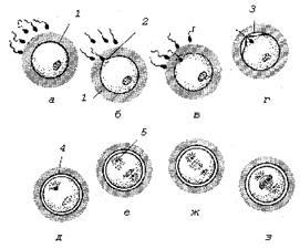 а–г – проникновение сперматозоидов в яйцеклетку;