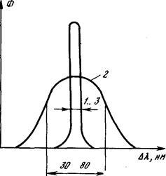 Рис.25. Ширина спектра лазера (1), светодиода (2)