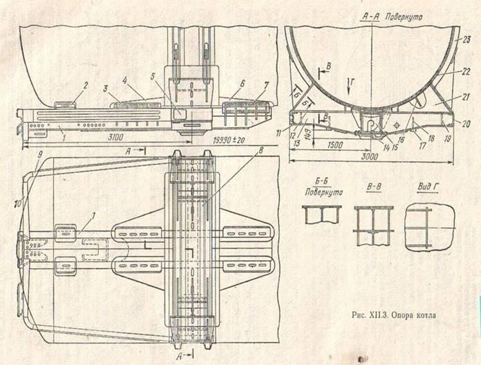 Сложным и ответственным узлом безрамной цистерны является опора котла (рис 3), поскольку через нее передаются основные нагрузки на котел и от котла на тележку. Опора, одновременно являющаяся консольной частью рамы, имеет мощные хребтовую 1 и шкворневую 8, облегченные концевую 10 и боковые 9 балки. На хребтовой и концевой балках размещены части автосцепного устройства, а на шкворневой – опоры кузова (пятник 14 и скользуны 17). Шкворневая балка имеет верхний лист 12, нижний 11, вертикальные листы 13, ребра 18 и 19, концевые части 20; к одной из таких частей прикреплена табличка 5 завода – изготовителя. На пересечении хребтовой и шкворневой балок размещено надпятниковое усиление 15. К шкворневой и хребтовой балкам приварены подкрепленный ребрами 21 и 16 опорный лист 22 толщиной 12мм, являющийся непосредственной опорой котла, а также опорные накладки 4 и 6, расположенные с двух сторон от шкворневого узла. Хребтовая балка связана с опорными накладками лапами 3 и 7, которые перед сваркой узла могут перемещаться вдоль хребтовой балки в зависимости от конкретных зазоров между опорой и котлом. Такая конструкция обеспечивает существенное снижение технологических напряжений. Применение опорных упрощенных элементов вместо прежних опорных конструкций стало возможным в результате подкрепления котла кольцевыми шпангоутами 23. осуществленное в данной конструкции дополнительное соединение 2 концевых участков котла с хребтовой балкой повышает ее сопротивление большим продольным усилиям, возникающим при соударении вагонов. Основные части котла и опор изготовлены из низколегированной стали марки 09Г2С(ГОСТ 5520 – 79). Восьмиосной цистерне присвоен государственный знак качества.