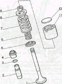1 - клапан; 2 - направляющая втулка; 3 - стопорное кольцо; 4 -маслоотражательный колпачок; 5 - опорная шайба пружин; 6 - внутренняя пружина; 7 - наружная пружина; 8 - тарелка пружин; 9 - сухари; 10 - регулировочная шайба; 11 – толкатель.