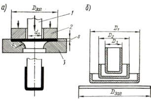 Вытяжкой называется процесс превращения плоской лил полой заготовки в открытое сверху полое изделие, осуществляемый при помощи вытяжных штампов (рис. 5, а