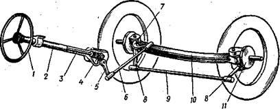 рулевой рычаг 7 с поворотным кулаком, соединенным шарнирно с осью 10.