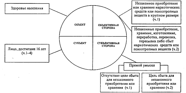 преступления носит сложный характер. Для ее описания законодатель использует альтернативную диспозицию. К числу деяний, образующих объективную сторону преступления, законодатель относит незаконные: изготовление; переработку; приобретение; хранение; перевозку; пересылку — в целях сбыта, а также сбыт.