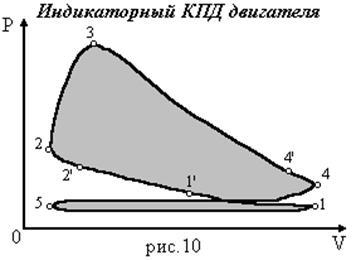 3. Процесс сгорания не происходит при постоянном объеме, а начинается в точке 2’ (рис. 10) и кончается после точки 3. В процессе сгорания тепло получается не извне, а за счет изменения химического состава рабочего тела. Химическая реакция сгорания не успевает закончиться полностью на линии сгорания (2-3), а продолжается в течение процесса расширения вплоть до момента выхлопа.
