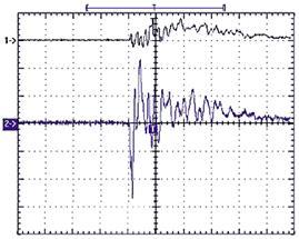 1) (Tek THS730A). CH1 100 V 2 uS 2) (Tek THS730A). CH2 500 V 2 uS Рис. 4. Осциллограмма коммутационной помехи в цепях питания узла связи (верхняя кривая - импульсное напряжение между нулем и землей узла связи, одно деление по вертикали – 100 В; нижняя кривая - импульсное напряжение между фазой и нулем, цена деления по вертикали - 500 В). Развертка по времени - 2 мкс на деление.