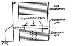 На схеме уровней (рис. 7) акцептору соответствует расположенный в запретной зоне недалеко от ее дна локальный уровень. Образованию дырки отвечает переход электрона из валентной зоны на акцепторный уровень. Обратный переход соответствует разрыву одной из четырех ковалентных связей атома примеси с его соседями и рекомбинации образовавшегося при этом электрона и дырки.