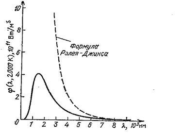 Эта формула удовлетворительно соглашается с экспериментом только в области малых частот (инфракрасном спектре) и резко расходится в ультрафиолетовом спектре. Из их формулы следовало, что вследствие теплообмена каждое тело должно отдать всю свою энергию излучению и охладиться до абсолютного нуля. Этот вывод был назван ультрафиолетовой катастрофой. Кривые зависимости испускательной способности φ(λ) абсолютно черного тела от длины волны. Сплошная кривая получена экспериментально, штриховая кривая построена по формуле Рэлея-Джинса. Из графика видно, что при λ→0 (ω→∞) r(ω,T)→∞.