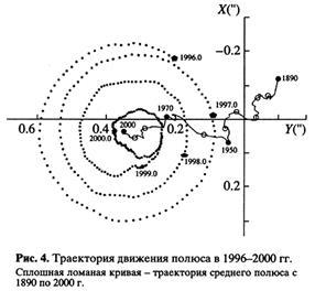 Изменяется не только угловая скорость Земли. Наша планета совершает небольшие колебания относительно оси вращения. Поэтому движутся точки, в которых ось пересекает земную поверхность (мгновенные полюса Земли). Они перемещаются по земной поверхности вокруг среднего полюса в направлении вращения Земли, то есть с запада на восток. Траектория движения полюса имеет вид спирали, которая периодически то закручивается, то раскручивается. Для примера на рисунке 4 показана траектория движения мгновенного Северного полюса за 1996-2000 гг. Его максимальное удаление от среднего отмечалось в мае-июле 1996 г. Затем полюс стал закручиваться, и это продолжалось до 2000 г., когда он подошел на минимальное расстояние к центру спирали. Сейчас полюс раскручивается и удаляется от своего среднего положения.