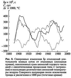 Состояние ледниковых щитов Антарктиды и Гренландии зависит от изменений климата. Поэтому флуктуации вращения Земли могут коррелировать с изменениями климатических характеристик и индексов. Установлена тесная связь десятилетних флуктуаций вращения Земли с изменениями эпох атмосферной циркуляции, колебаниями глобальной температуры воздуха, региональных осадков и облачности и даже с изменениями уловов промысловых рыб в Тихом океане. Замечено, что каждому режиму вращения Земли соответствует своя форма атмосферной циркуляции и, следовательно, свой режим погоды в различных районах земного шара. На рисунке 8 приведен ход изменений скорости вращения Земли, температуры воздуха в Северном полушарии и накопленной суммы аномалий повторяемости типа С атмосферной циркуляции за 1891-1998 гг. Сопоставление кривых показывает их тесную корреляцию.