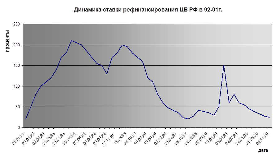 В России главной задачей денежно-кредитной политики в первые годы рыночных реформ была борьба с инфляцией, развязанной внезапным освобождением товарных цен в начале 1992 года. С этой целью ставка рефинансирования ЦБ РФ поддерживалась на весьма высоком уровне и возрастала вплоть до начала 1995 года, после чего стала снижаться по мере ослабления инфляции. Среднегодовая ставка рефинансирования составляла 144% годовых в 1993 году, 187% в 1994 году, 185% в 1995 году и 99% в 1996 году. К концу 1996 года она снизилась до 48%, а к сентябрю 1997 года – до 24%. Наметившаяся в 1996 году тенденция снижения общего уровня процентных ставок получила дальнейшее развитие в 1997г. и начале 1998 г. (повышение ставки рефинансирования в ноябре 1997 года и феврале 1998 года носило антикризисный и кратковременный характер), что показывает диаграмма №1, отражающая динамику изменения ставки рефинансирования Банка России (построенная по данным, публикуемым на официальном электронно-информационном сервере Банка России).