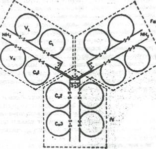В настоящее время на основании изучения первичной структуры полипептидных цепей выдвинута так называемая "доменная" гипотеза строения иммуноглобулинов, согласно которой молекулу иммуноглобулинов можно разбить на участки с относительно независимыми конфигурациями в виде глобул. Каждый домен состоит приблизительно из 100-110 аминокислотных остатков и имеет одну дксудьфидную связь, которая связывает участки цепей, образуя петлю из 60 аминокислотных остатков (Еdelman, 1970; Незлин, Рохлин, 1970; Роljak, 1972).