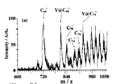 , полученной в масс-спектрометре ионно-циклотронного резонанса с фурьепреобразованием. Как показывают измерения, атом иттрия, входящий в состав экзоэдрального соединения легко окисляется с образованием YO, в то время как эндоэдральный комплекс сохраняет стабильность даже при повышении концентрации N02