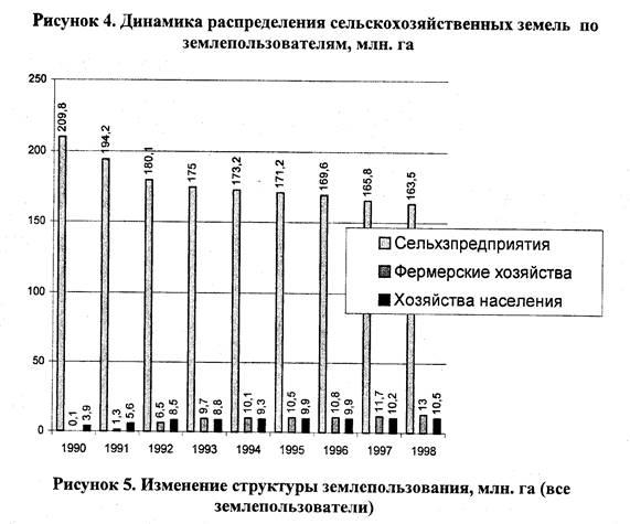 Общая тенденция последнего десятилетия - общее сокращение сельскохозяйственных угодий, особенно пастбищ; сокращение угодий сельхозпредприятий; усиление активности индивидуальных и частных форм сельского хозяйства (рис. 4, 5); сокращение объемов производства (рис. 6) и остановка лавинообразной миграции из села в город (рис. 1). Эти процессы связаны с общим структурным кризисом в российской экономике; фактическим устранением государства от проблем сельских регионов; направленностью населения на выживание в пределах натурального хозяйства; развитием рьшка сельскохозяйственной продукции и его новых субъектов.