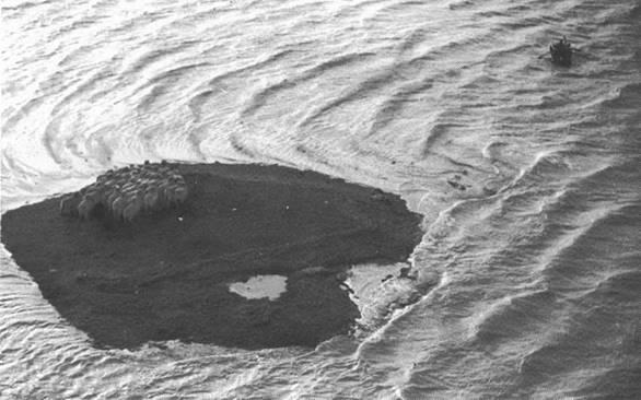 Бедные овцы на островке во время наводнения в Англии 1960 год.