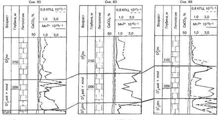 На рис.1 показан пример выделения опорных пластов методом ЭПР-спектроскопии по скв.83, 93, 99 Южно-Сергеевского месторождения (Башкортостан). Измерения проводились главным образом на пробах бурового шлама, которые отбирались в процессе бурения через 1 - 3 м проходки. Масса анализируемой навески составляла 0,2 г измельчённой породы. Время анализа - 5 мин. Всего по трём скважинам было проанализировано свыше 400 образцов. По аномально-высокой концентрации Мn2+