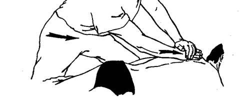 2. Затем выполняют глубокое трение ребром ладони с отягощением — длинными движениями вдоль позвоночника в темпе — одно движение за 1—1,5 секунды, поочередно слева и справа, по 10—12 движений с каждой стороны (рис. 7). (Недопустимо жесткое давление на костные выступы).