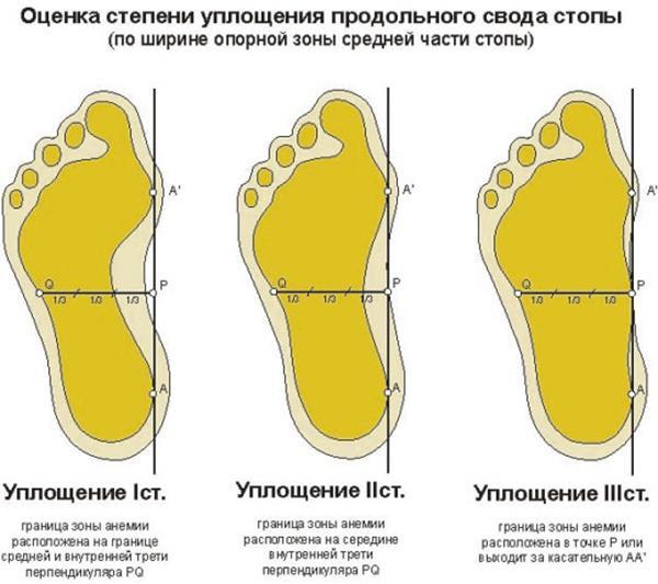 делается по расположению границ зоны анемии в среднем отделе стопы по отношению к третям перпендикуляра PQ