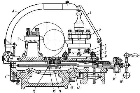 Устройство резцедержателя показано на рисунке слева. В центрирующей расточке верхних салазок 5 установлена коническая оправка 3 с резьбовым концом. На конусе оправки установлена четырехсторонняя резцовая головка 6. При вращении рукоятки 4 головка 2 перемещается вниз по резьбе конической оправки 3 и через шайбу 1 и упорный подшипник обеспечивает жесткую посадку резцовой головки 6 на конической поверхности оправки 3. От поворота при закреплении резцовая головка удерживается шариком, который заклинивается между поверхностями, образованными пазом на основании конической оправки 3 и отверстием в резцовой головке 6. При необходимости сменить позицию инструмента рукоятку 4 поворачивают против часовой стрелки. При этом головка 2 поворачивается и перемещается вверх по резьбе конической оправки 3, снимая усилие затяжки резцовой головки 6 на конусе конической оправки 3. Одновременно головка 2 поворачивает резцовую головку 6 посредством тормозных колодок, фрикционно связанных с поверхностью расточки головки 2 и соединенных с резцовой головкой 6 штифтами 7. При этом шарик, расположенный у основания конической оправки 3, не препятствует повороту резцовой головки, так как он утапливается в отверстие, сжимая пружину. Если в процессе работы рукоятка 4 (в зажатом положении) стала останавливаться в неудобном положении, то, изменяя толщину шайбы 1, можно установить ее в удобное для рабочего положение.