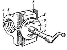 Продольная подача суппорта 1 от ходового винта 2 производится включением разъемной гайки рукояткой 14 (смотри рисунок слева). Разъемная гайка состоит из двух частей (1 и 2), которые перемещаются по направляющим А при повороте рукоятки 5. При этом диск 4 посредством прорезей В, расположенных эксцентрично, перемещает пальцы 3, в результате чего обе части гайки сдвигаются или раздвигаются. Если обе части гайки охватывают ходовой винт, то производится продольная подача (перемещение) суппорта; если они раздвинуты, то подача отключается.