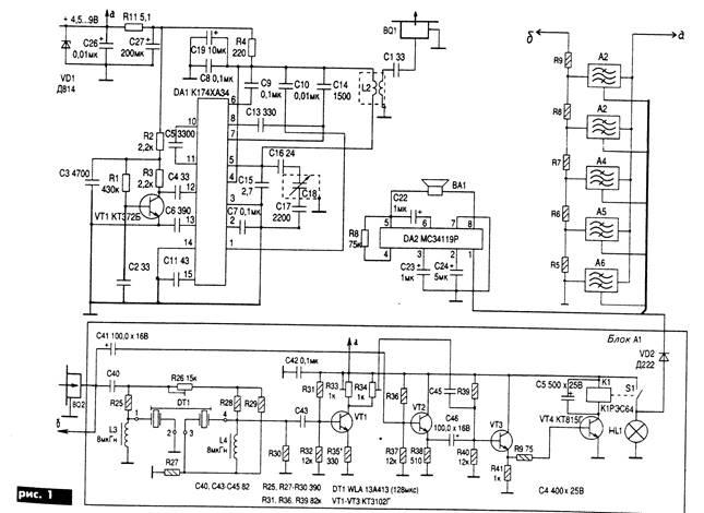 Конструкция металлоискателя (рис. 1) состоит из передатчика, собранного по отечественной микросхеме типа К174ХАЗА по емкостной трехточке с параметрической стабилизацией частоты на транзисторе VT1, многоканального приемника в виде линейки частотно-селективных преобразователей-индикаторов Al…A6 и сигнализатора обнаружения на микросхеме типа МС34119Р (DA2). Передатчик, запитанный от одной-двух плоских батареек, нагружен на пьезоэлектрический излучатель BQ1, который для увеличения рабочей частоты укреплен на платформе из электротехнической стали весом 2 кг.