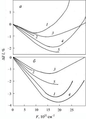 2 - БиАЭС; 3 - ЛАЭС-1; 4 - АВ-2; 5 - АМ-1. Температура облучения 500—600 °С (1—4) и 350—450 °С (5)