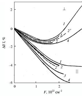 Рис. 4. Зависимость относительного изменения размеров образцов мелкозернистых графитов на основе прокаленных нефтяных коксов от флюенса нейтронов.