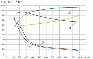 На графиках рис.1 и рис.2 представлены зависимости крутящих моментов на выходном валу Т и КПД η от частоты вращения n для двух типов рабочих смазок. На рис.1 вариатор смазывался моторным маслом М-8, а на рис.2 – высокотяговой смазкой (трактантом) «Сантотрак-50» (Santotrac-50), предназначенной специально для вариаторов, и изготовляемой в США фирмой Findett Corporation. Кроме того, учитывая несимметричность системы отбора момента при вращении валов вариатора в разных направлениях, опыты были проведены при вращении их в двух различных направлениях. Кривая 1 характеризует КПД вариатора, кривые 2 и 3 – крутящие моменты при вращении входного вала по часовой стрелке и против нее (видно, что эти кривые очень близки друг к другу).