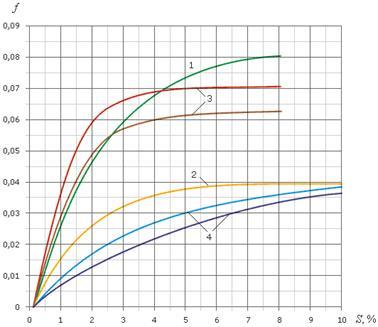 Рис. 3. Зависимость коэффициентов трения f от скольжения S