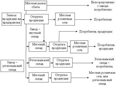 В случае распределения многих видов продукции существует несколько возможных маршрутов от продуцента к потребителям; некоторые из них показаны на рис. 2. Продукция может отгружаться с завода потребителю, поступать с завода потребителям через региональный склад или по маршруту: завод – региональный склад – местный склад – потребители. Если число альтернатив становится чрезмерно большим, анализ может потребовать компьютеризации.