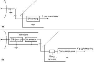 Рис. 4. Схемы установки высокочастотного фильтра: а) без усилителя; б) с усилителем