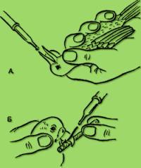 При введении жидких лекарственных средств через открытый клюв дозирование более точное, но часть препарата может вытекать обратно. Возникает опасность аспирации, поэтому можно рекомендовать следующий способ фиксации пациента: птицу держат вверх и несколько косо, голова фиксируется между указательным и большим пальцами (рис. 2).