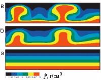 термо-конвективная модель, обусловленная гравитационным перераспределением пород в земной коре под воздействием флюидно-теплового потока [3]. Количество материала, снесенного с континентальной коры в бассейн осадконакопления в процессе эрозии, несопоставимо с объемом вулканогенных пород. Даже ложе окраинных морей, - наиболее крупных бассейнов аккумуляции снесенного с континентов материала, - на 80 - 90% состоит из вулканических пород, возникших в процессе активной деятельности подводных вулканов. Состав и плотность этих пород закономерно изменяются в сторону верхних частей вулканогенных толщ: низы разрезов сложены кислыми вулканитами, затем следуют андезиты, а верхи представлены базальтами [9]. Плотность кислых пород примерно на 20% ниже плотности базальтов. Ясно, что разрезы таких толщ потенциально неустойчивы в гравитационном поле Земли: любое термальное возмущение приведет к снижению вязкости и плотности пород, и в пределах каждой такой толщи произойдет гравитационное перераспределение материала. Если геологический разрез двухслойный, то возникнут простые диапиры