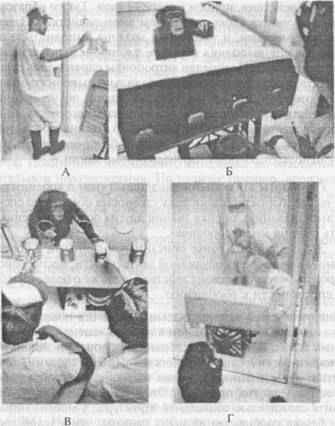 Шимпанзе обучен находить кусочек лакомства, спрятанный под одним из 4 непрозрачных стаканов (см. рис. 5). Перед опытом один из экспериментаторов демонстративно уходит из комнаты (А), а другой прячет (незаметно для обезьяны) приманку под одним из стаканов (Б), но под каким именно она не видит, так как они отгорожены ширмой. Ушедший возвращается, и теперь оба человека пытаются подсказать ей, где лакомство, однако при этом указывают на разные стаканы (В). Поскольку обезьяна видела, что один из людей отсутствовал, и не мог знать, где находится пища, она, как правило, следовала указаниям того экспериментатора, у которого, по ее мнению, были знания о предмете. Модификацией такого опыта была ситуация, когда первый экспериментатор не уходил, а надевал на голову ведро, препятствовавшее обзору (Г). Его «указания» обезьяна игнорировала и на этот раз.