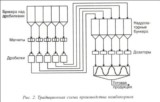 первый - комбикормовые заводы, работающие по традиционной технологии (рис. 2). К таким предприятиям относят комбикормовые заводы, не имеющие отдельных узлов предварительного дозирования и смешивания трудносыпучих, минеральных, зерновых и гранулированных компонентов. Все виды сырья подают по самостоятельным линиям параллельными или последовательными потоками;