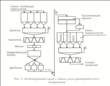 В состав первой смеси входят шрот и сырье минерального происхождения. Ее готовят в отдельно стоящем складе для хранения минерального сырья. Часть шрота используют как наполнитель. Приготовленную смесь направляют на линию предварительного дозирования трудно сыпучего сырья. Сюда поступают дрожжи, мясокостная, рыбная мука, премиксы и др. Вторая смесь состоит из трудносыпучих компонентов (дрожжи, мясокостная, рыбная мука, премиксы) и смеси сырья минерального происхождения со шротом. Третья смесь включает предварительно сдози рованное и смешанное зерновое сырье (пшеница, ячмень, кукуруза), гранулированную травяную муку, отруби, шроты. Смесь этих видов сырья как один компонент направляют на измельчение, а после измельчения на главную линию дозирования и смешивания. На этой линии создают непрерывный поток подготовленных компонентов, который обеспечивает ритмичное производство комбикормов.