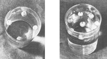 Эффектный опыт, Показывающий, как неустойчивость приводит к образованию определенной структуры, можно провести с десятком иголок. Необходимо намагнитить их в одинаковом направлении, скажем, прикладывая ушко к северному полюсу подковообразного магнита, а острие – к южному. (Если у вас нет подковообразного магнита, воспользуйтесь самодельным электромагнитом. Изолированный провод намотайте в несколько слоев на бумажную трубку и, подключив концы этой катушки к батарейке, поместите внутрь иголки). Иголки воткните в небольшие кусочки пробки или пенопласта, покрытые парафином, – получатся магнитные поплавки. Опустите их в стакан с водой. Поскольку одноименные полюса магнитов отталкиваются, а иголки ориентированы одинаково, поплавки расплывутся в разные стороны, стремясь максимально удалиться друг от друга – при этом энергия всей системы наименьшая. Поплавки образуют правильные фигуры: три поплавка – равносторонний треугольник, четыре – квадрат, пять – пятиугольник. Если поплавков много, устойчивыми будут несколько конфигураций – один поплавок находится в центре, остальные рассредоточены по краю стакана. Понятно, что такой рисунок не могут образовать два или три поплавка. А при каком наименьшем их числе структура с поплавком в центре будет устойчивой? Попробуйте определить это на опыте.