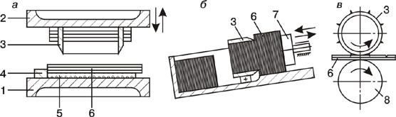 Рис. 2.6. Схемы высечки: а — ножевой резки; б — неподвижным ножом; в — ротационной. 1 — неподвижная плита; 2 — подвижная плита; 3 — фигурный нож; 4 — упор; 5 — марзан; 6 — полуфабрикат; 7 — толкатель; 8 — опорный вал